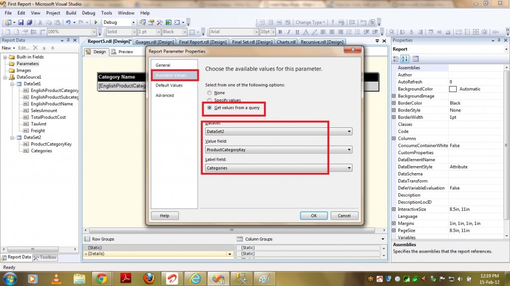 • Now select the “Available Values” tab which is on the Left hand side of the wizard and select the option “Get Values From a Query”. Provide the Dataset name,Value Field and Label Field as shown below –
