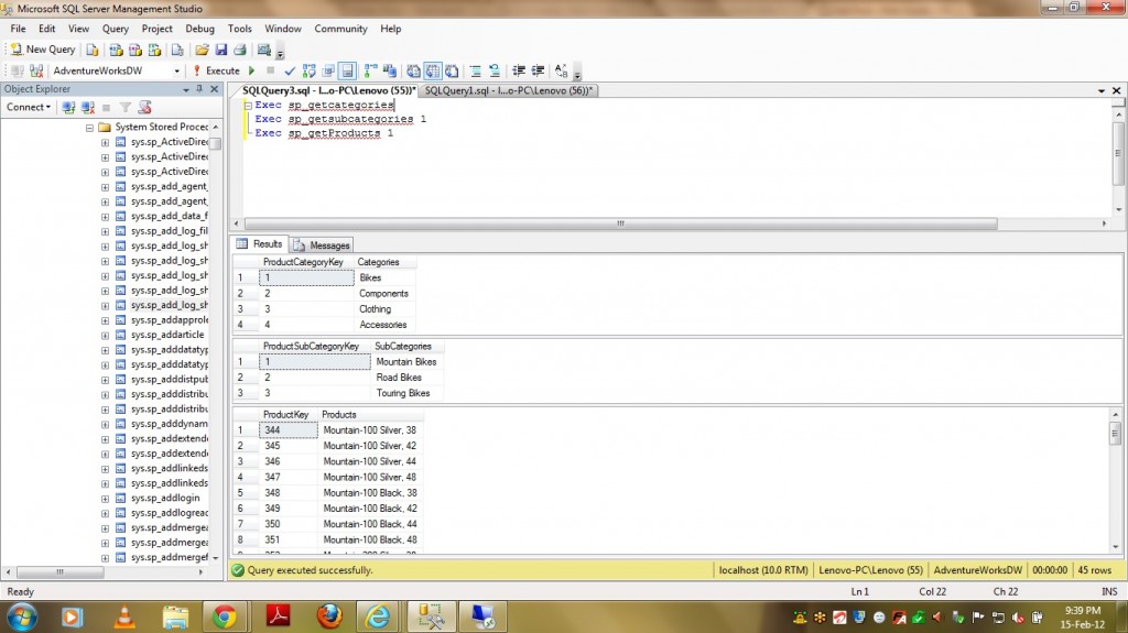 If you see the code for all the three SPS, the first one has no parameter and it pulls all the Categories. The second one pulls Subcategory names based on the CategoryKey we pass. The third one pulls Products info based on the SubcategoryKey we pass. PFB the screenshot showing the result set of the SPS.
