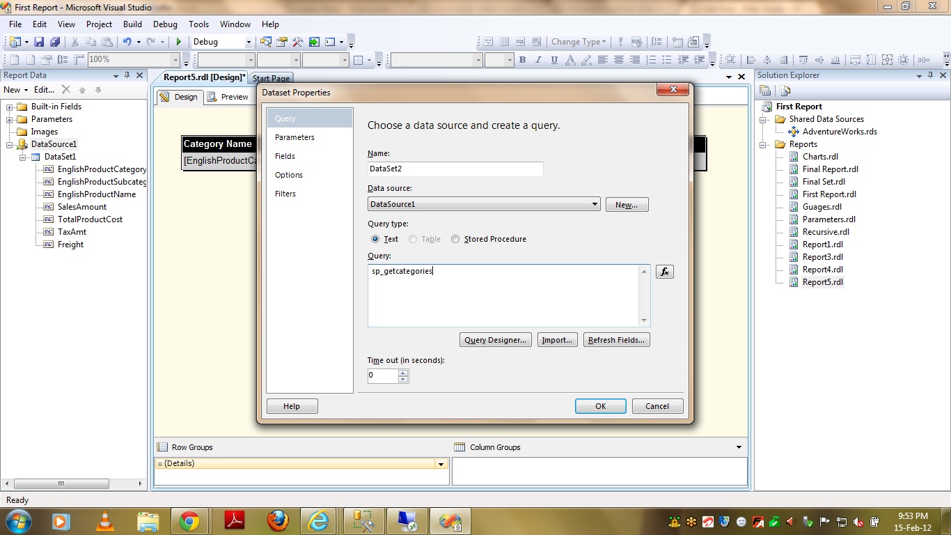 • Select the data source and select the option “Stored Procedure” radio button and provide the Stored Procedure name which pulls values for parameter and as I am adding “Category” as parameter I am using the following stored procedure which pulls Categories data.