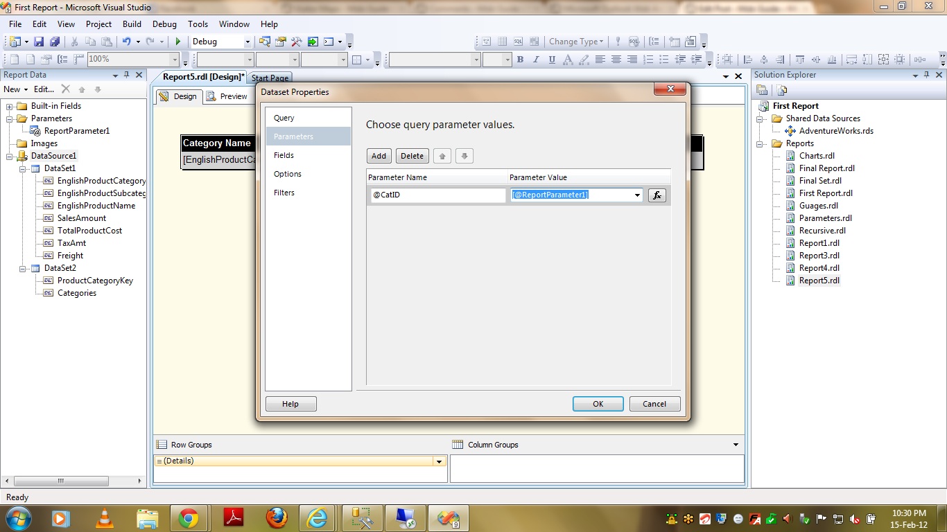 At this point of time there are no Parameters defined and hence you will get all the data from the database and will be displayed in the report. PFB the steps to be followed to ADD PARAMETERS to your report using SPS as source –