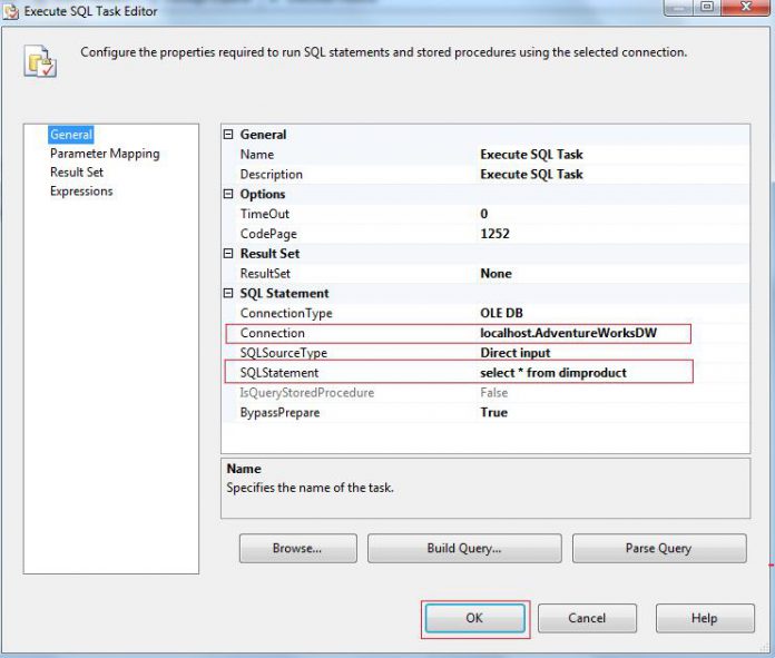 2. Now for each task, set the valid database connections and write the SQL query that is to be executed for each task as shown in the below figure.  To set the database connections and to write SQL query, double click on Task rectangle, the the following window will be opened. Then click on “OK” button. Similarly set the database connection and write the valid SQL query for Task1 also.