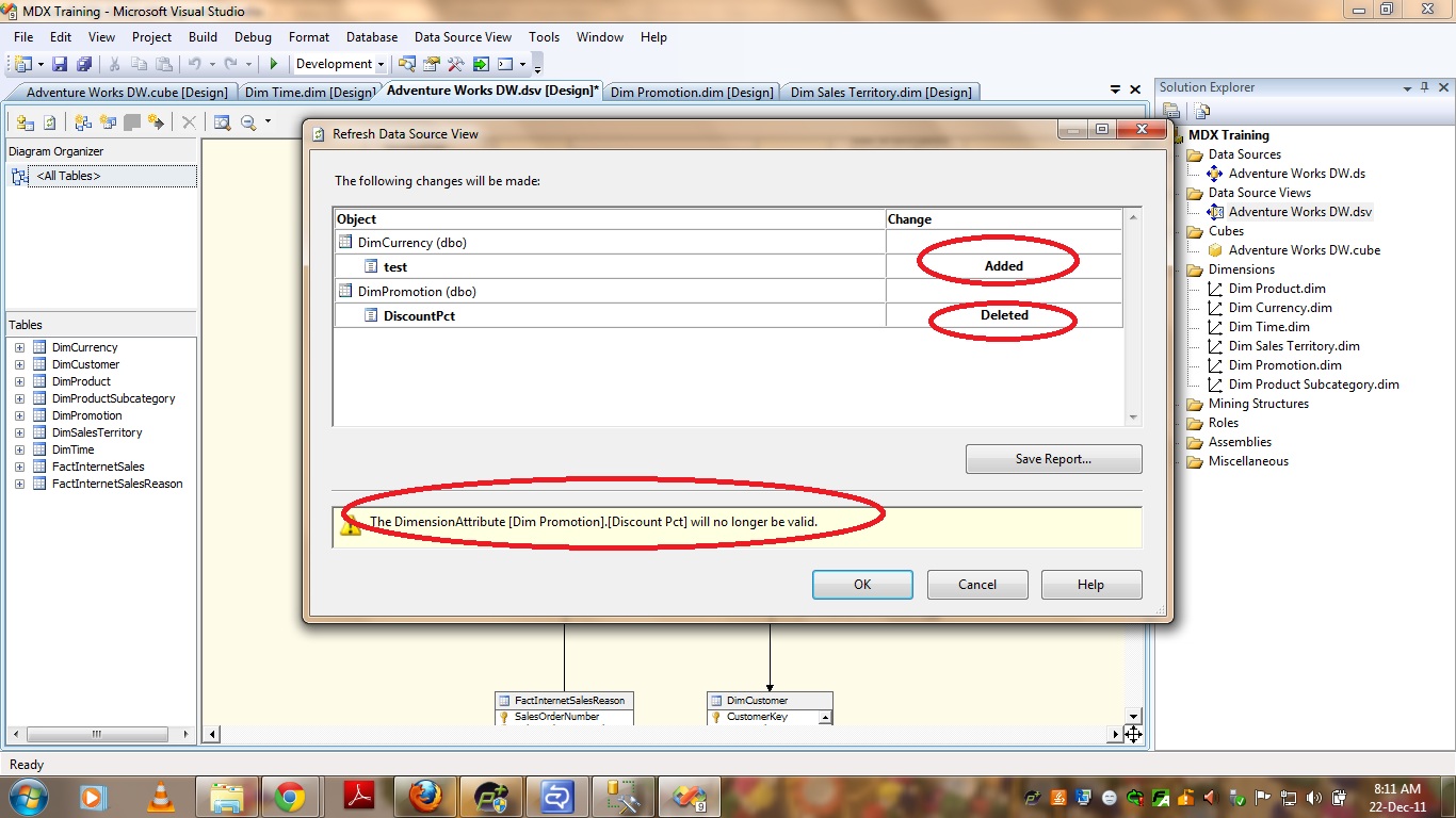 To demostrate the same I added one column “TEST” to DimCurrency table which is part of the DSV I designed and removed one column “DISCOUNTPCT” from the table DimPromotion and then I select Refresh in DSV and PFB the screenshot showing the list of changes occured in my underlying data source.