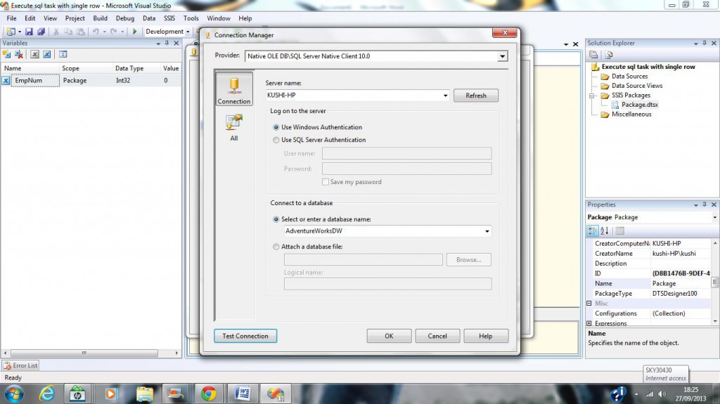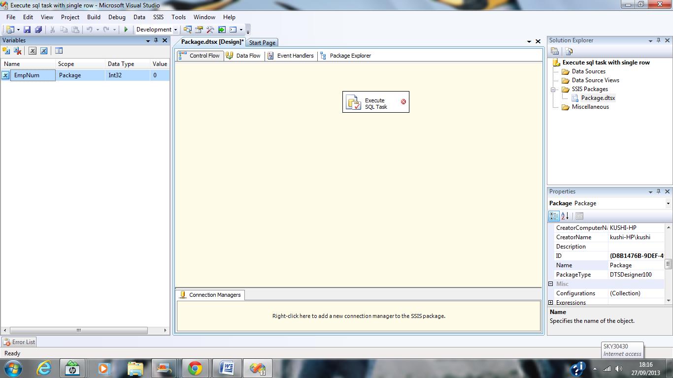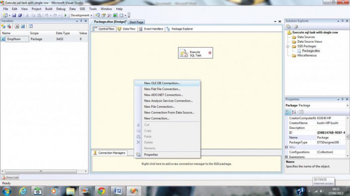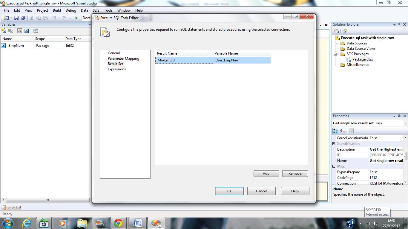 Name the new variable EmpNum, and ensure that the scope is set at the package level, as indicated by the package name. (Here my package name is Execute sql task with single row). Next, set the data type to Int32 and the value to 0. The Execute SQL task will use the variable to store the value it retrieves from the database.