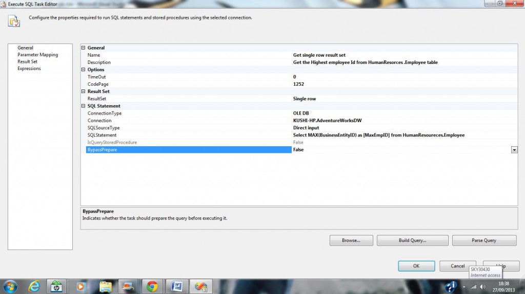 In this scenario, I’ll use Execute SQL task. The task retrieves a single value from a table in theAdventureWorks2008 database. That value is returned by the task as a single-row result set.