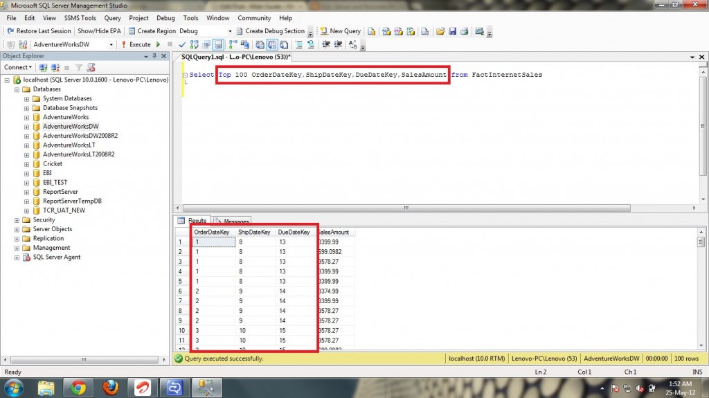 Select Top 100 OrderDateKey,ShipDateKey,DueDateKey,SalesAmount from FactInternetSales