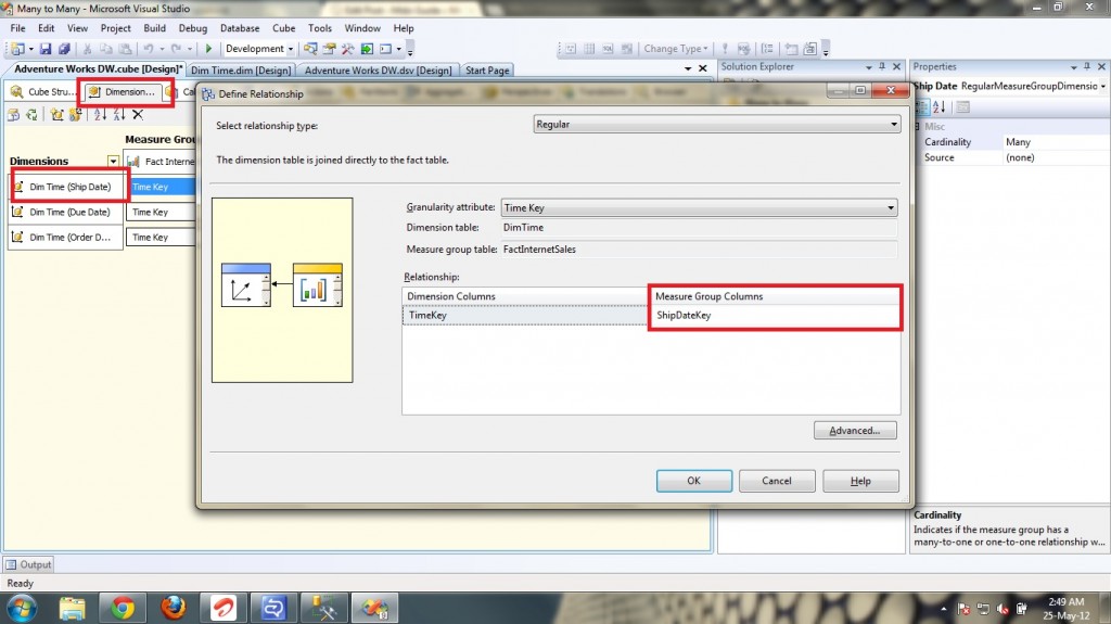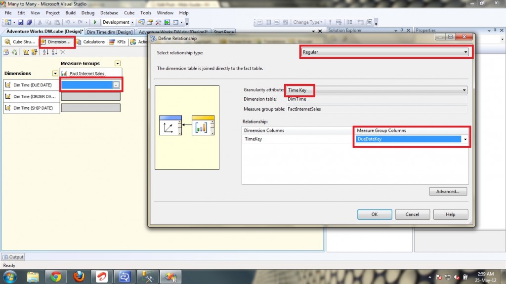 4) Go to Dimension Usage tab and click on the cell of each intersecting point and select the relationship type as REGULAR in the pop up wizard and select the columns to link. In the below screenshot I selected DueDateKey under MEasure Group Columns as I am relation DUE DATE Dimension to Fact table. Similarly we have to use OrderDateKey and ShipDateKey for Measure Group Columns to link with ORDER DATE Dimension and SHIP DATE Dimension respectively.