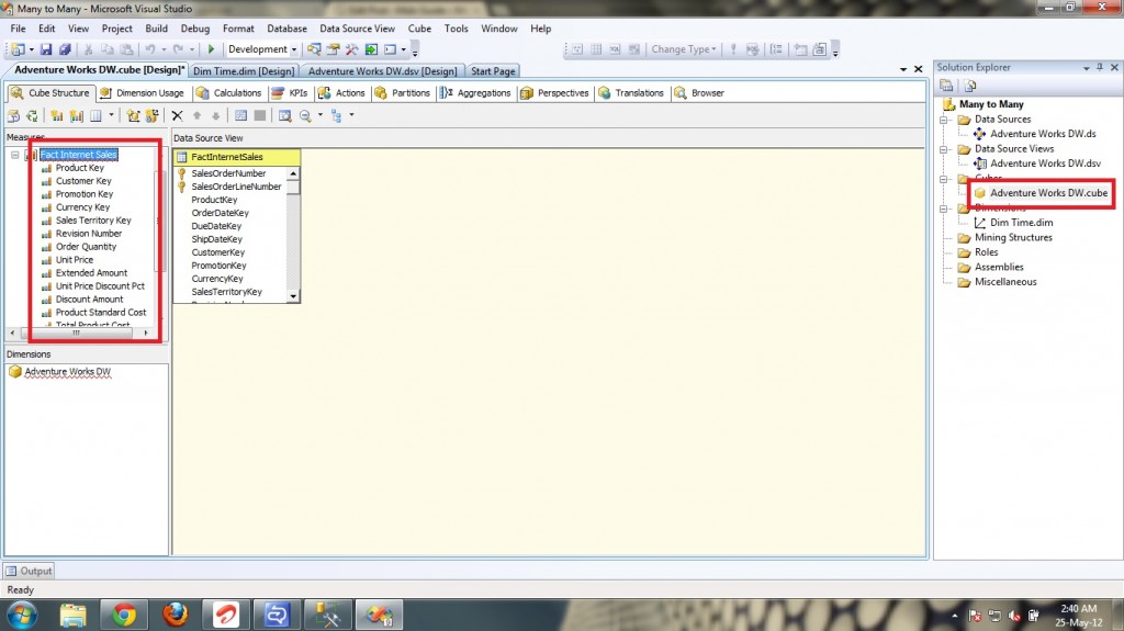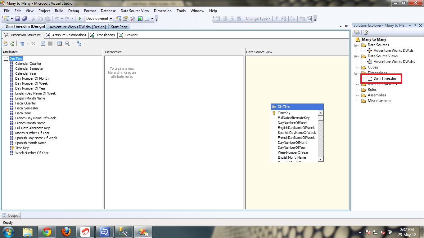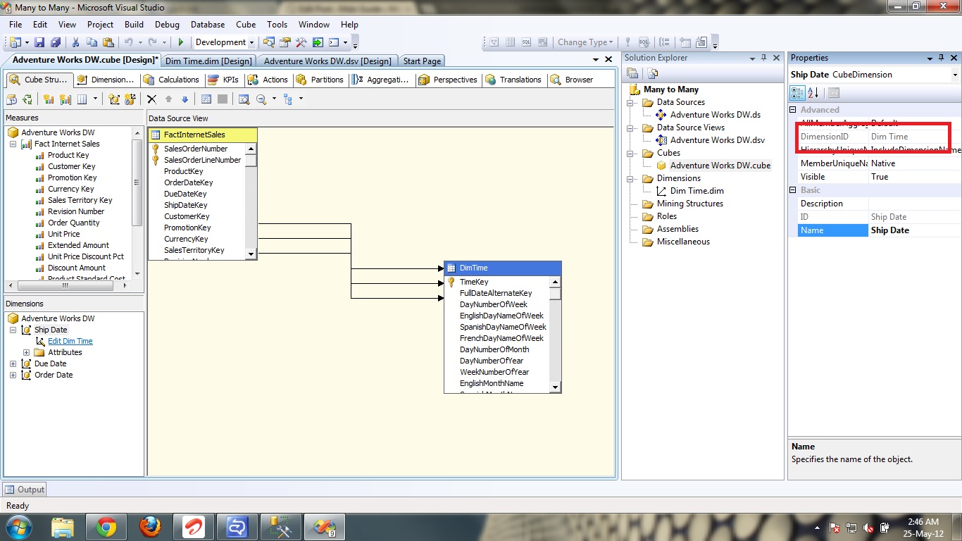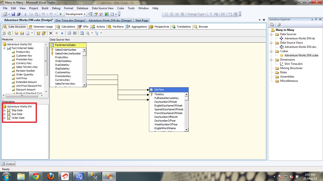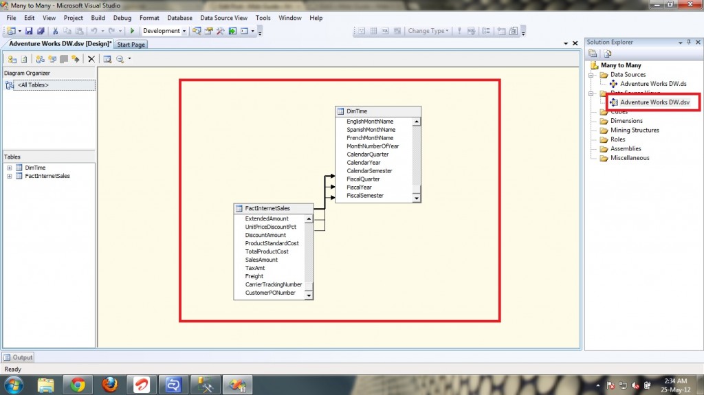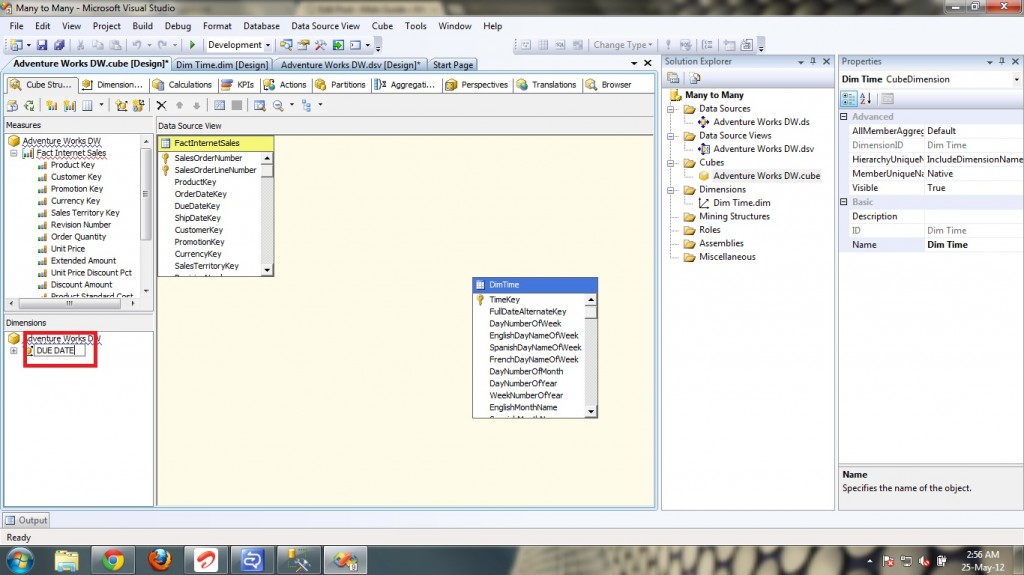1) Add the fact table and the Dimension table to DSV as shown below and make sure RELATIONS are given for three date keys in Fact table to DimTime table.
