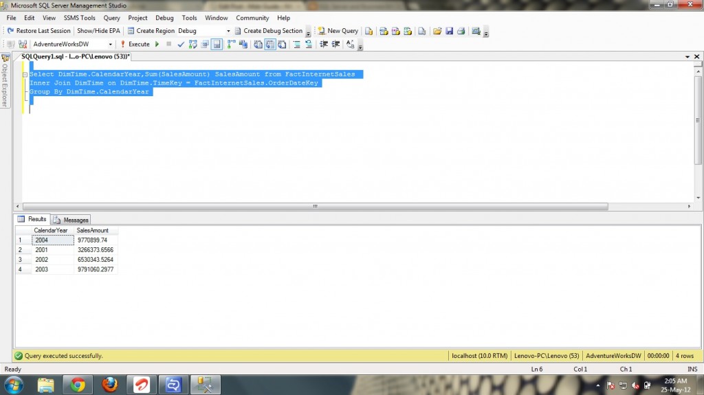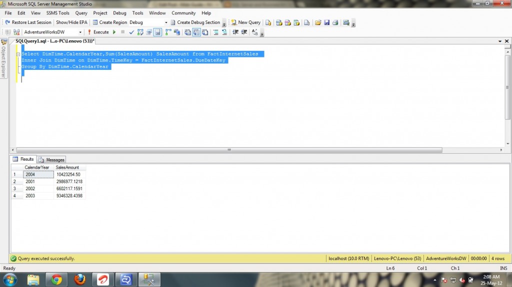 In the above query I joined fact table (FactInternetSales) with Time table(DimTime) with SHIPDATEKEY as I wish to see the Sales year wise based on Shipments and the output can be seen in the screenshot given below.