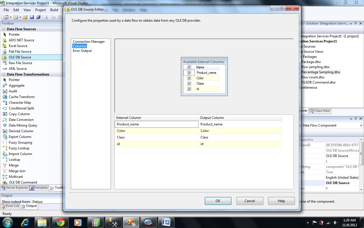 • Now select the columns that needs to be present as part of source by going to Columns Page in OLE DB Data Source as shown below.