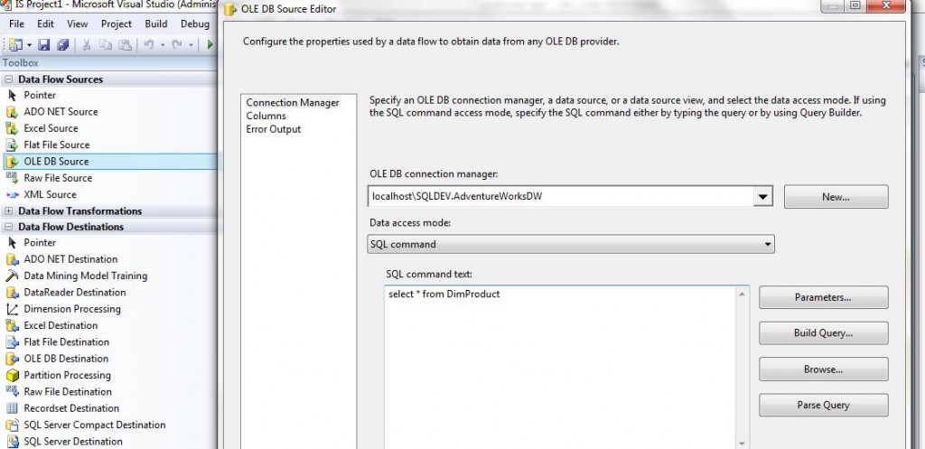 Add a dataflow task and create a connection manager that connects to the AdventureWorksDW database. Add an OLE DB Data Source to the Data Flow design surface. Configure the source to point to your AdventureWorksDW database’s connection manager.