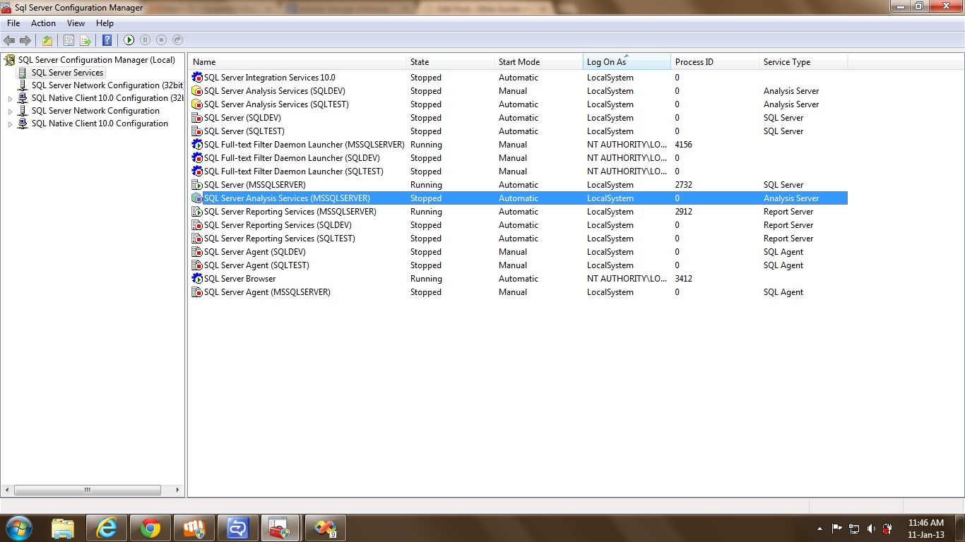- First step is pass and not lets check whether the SSAS is installed in the given server or not. To check the same navigate to this path. Start –> All Programs –> Sql Server <Version> –> Configuration Manager –> Sql Server Configuration Manager as shown below.