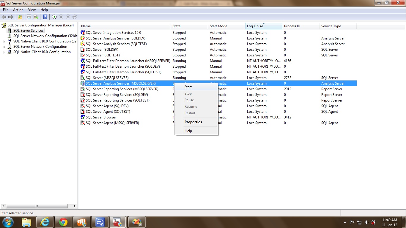 - From the above pic it is clear that SSAS is installed in my computer and the problem is that the SERVICE is STOPPED. So what to do now ? Just right click and start the service yaar as shown below.